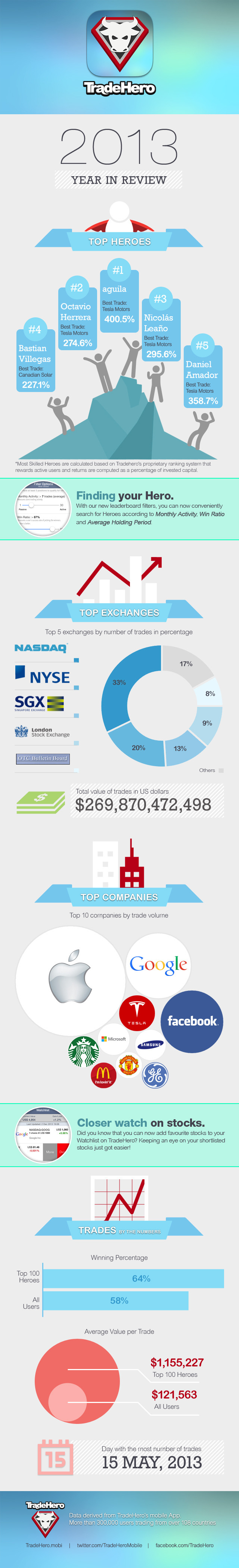 2013 was a great year for social trading and an even better year for TradeHero. We now offer stocks from over 28 stock exchanges, a marked improvement from the 8 we started out with. That’s a total of over 140,000 stocks you can now trade on TradeHero. We have also seen $270,000,000,000 worth of trades completed in the year.